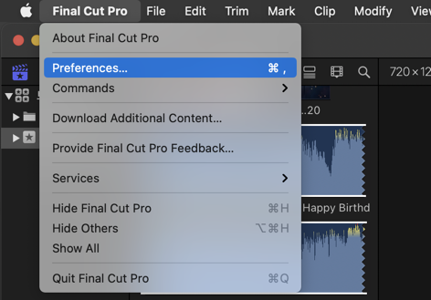 첫번째 - 작업 표시줄에 Final Cut Pro --> Preference 로 들어갑니다.