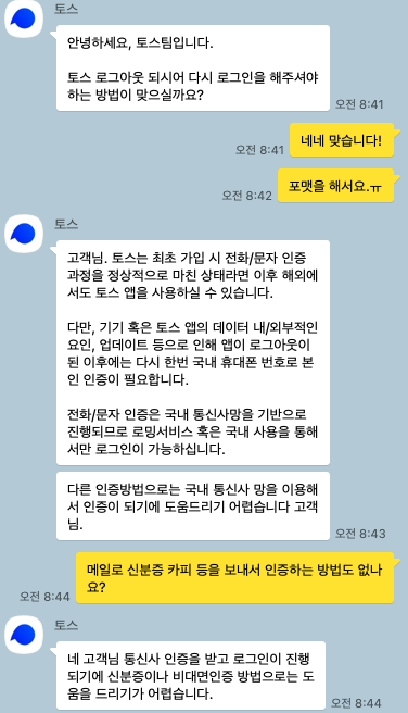 우선 첫 번째로 토스 서비스센터에 문의를 하였습니다.