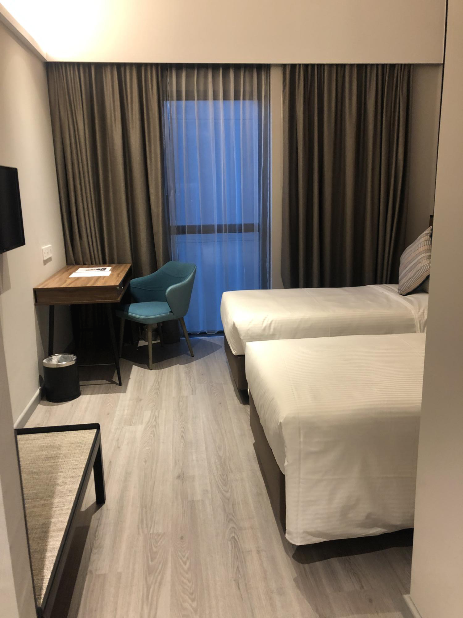 3. 호텔 시설 : 오픈한지 얼마 안 된 호텔답게 깨끗한 편. 싱가포르 호텔 치고는 방도 꽤 넓고 천정도 높아서 답답한 느낌은 없다. 서비스 아파트먼트를 지향하는 곳답게 공동 주방, 세탁실, 헬스장, 수영장 (수영장이 엄청 크지는 않았다.)이 있으며 내가 선택한 가장 작은 방 (Studio Twin) 같은 경우 냉장고, 작은 싱크대, 전자레인지, 접시, 포크 등이 구비되어 있었다.